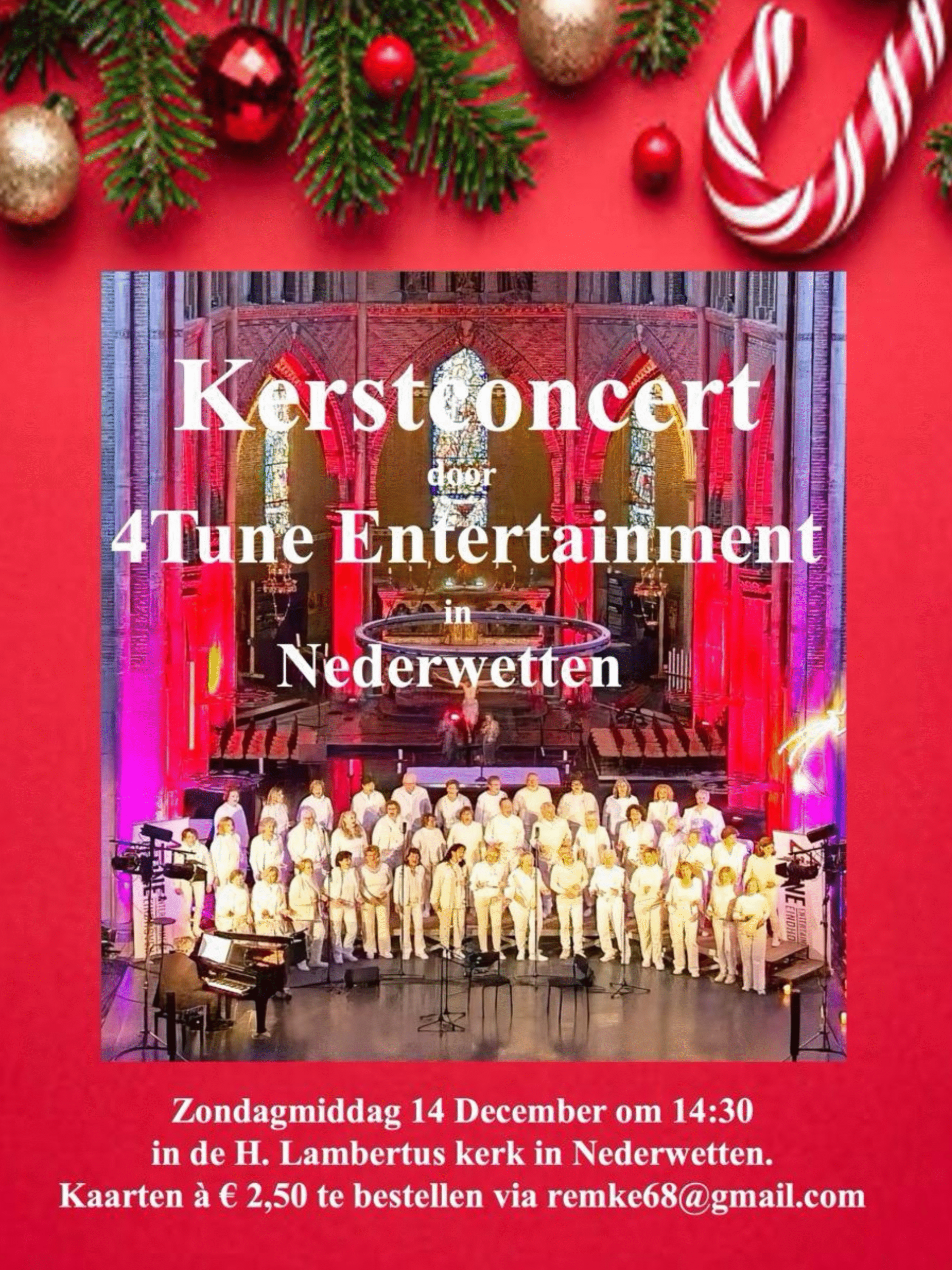 Programma: Zondagmiddag 14 december geeft 4Tune Entertainment onder leiding van Dan Loredan een kerstconcert in de Lambertuskerk in Nederwetten. Laat je meeslepen door de magie van kerst! Ons enthousiaste koor van maar liefst 50 zangers en een live combo brengt een feestelijk programma vol prachtige kerst- en sfeerliederen om je alvast helemaal in kerststemming te brengen.
